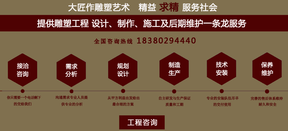 成都大匠作雕塑有限公司,是經(jīng)成都工商局審定注冊的正規(guī)專業(yè)雕塑制作及工程安裝服務(wù)機(jī)構(gòu),是由一群年輕富有朝氣的年輕人創(chuàng)辦,發(fā)軔于四川省成都市龍泉驛區(qū)。它是一家******于創(chuàng)作、制作和銷售為一體的公司。大匠作擁有多年從事公共藝術(shù)的專業(yè)人員和雕塑制作人組成的核心團(tuán)隊(duì),為您提供專業(yè)、具創(chuàng)新的設(shè)計及制作服務(wù)。公司成立以來,秉承“******服務(wù)、誠信為本”的宗旨,以客戶需求為目標(biāo)導(dǎo)向,不斷學(xué)習(xí),進(jìn)取,優(yōu)化和提高服務(wù)質(zhì)量,公司向您******——“您的滿意***是我們的信譽(yù)”,我們將以飽滿的熱情和******的服務(wù)贏得您的贊譽(yù)和支持。 愛心,細(xì)心,耐心,責(zé)任心是我們的要求,盡心盡職,為您打造出創(chuàng)新、專業(yè)、******的設(shè)計方案,我們堅信先做人、后做事,用心對待客戶,實(shí)行透明收費(fèi),人性化服務(wù),本著對客戶負(fù)責(zé),對客戶負(fù)責(zé),更是對自己發(fā)展負(fù)責(zé)的態(tài)度,爭取做到讓每位客戶滿意